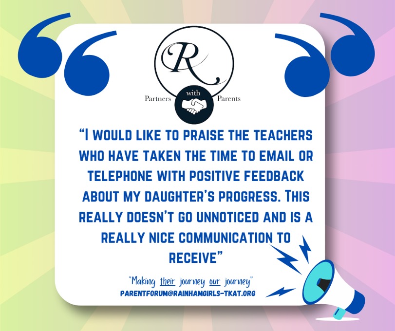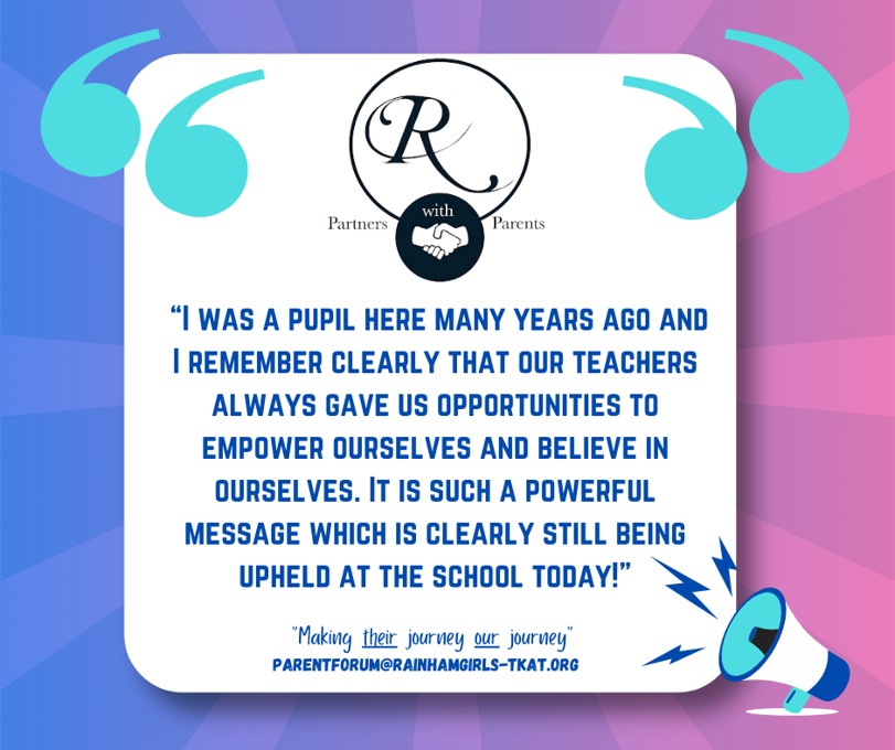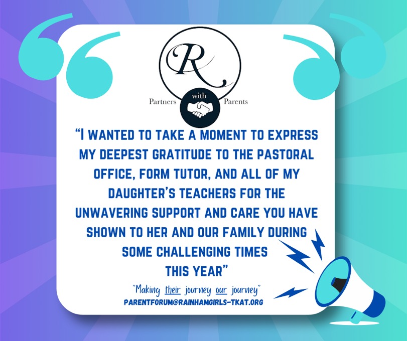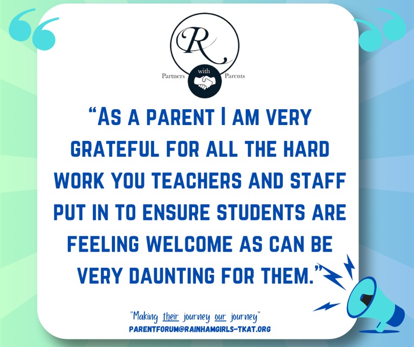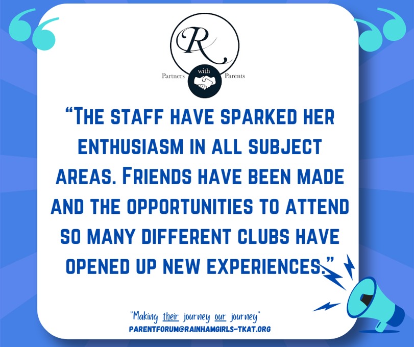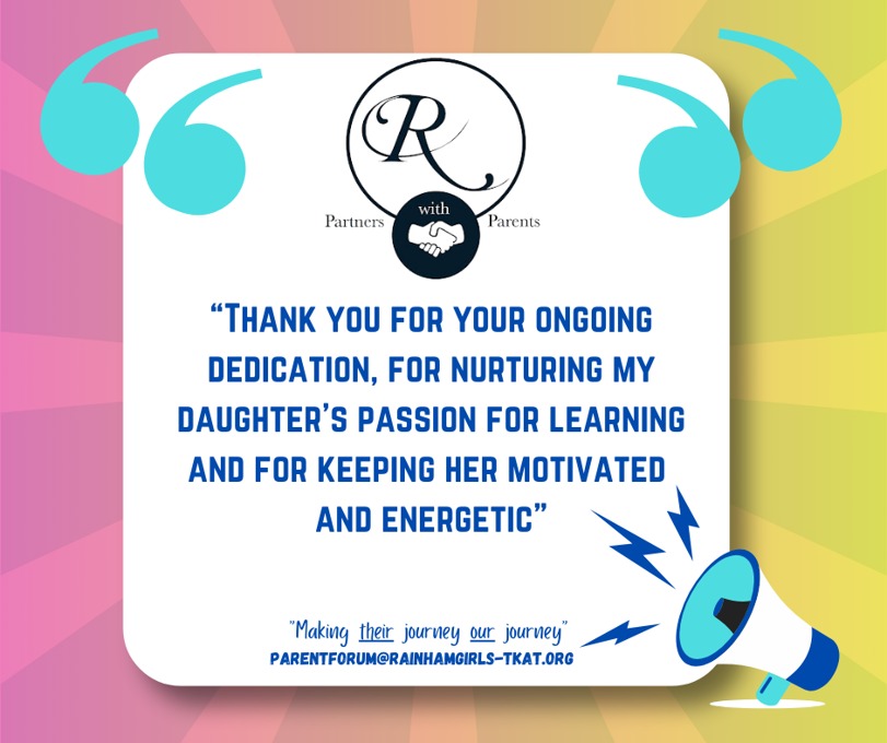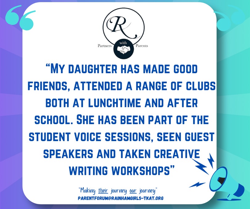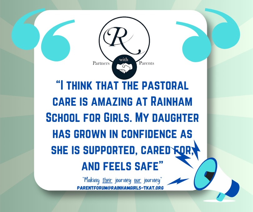 At Rainham School for Girls, we believe that a strong partnership between parents and school enriches every student’s experience. Our Parent Forum is at the heart of this collaboration, providing a welcoming and inclusive space where parents can actively engage with school life. Through parents’ evenings, ‘parent voice’ opportunities, and ongoing dialogue, we ensure every parent’s perspective is heard and valued.