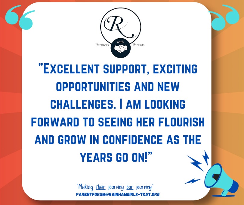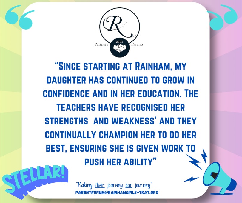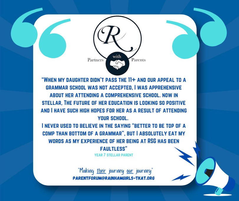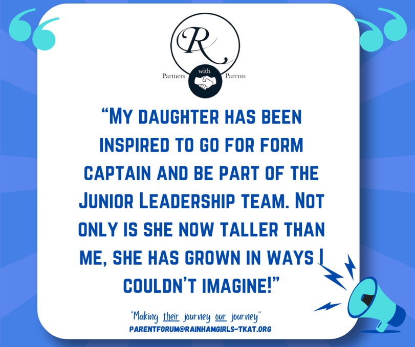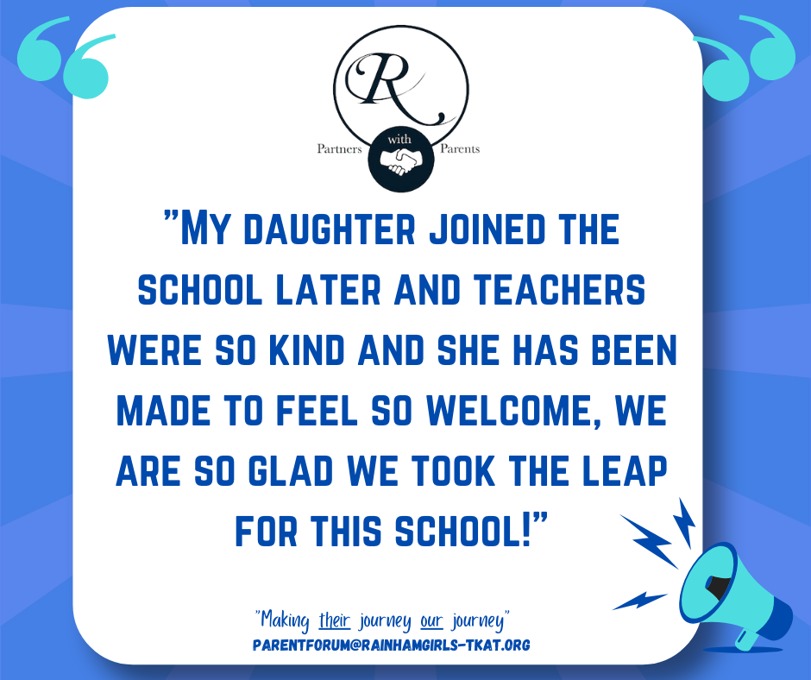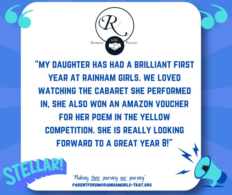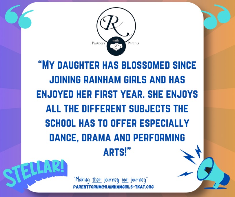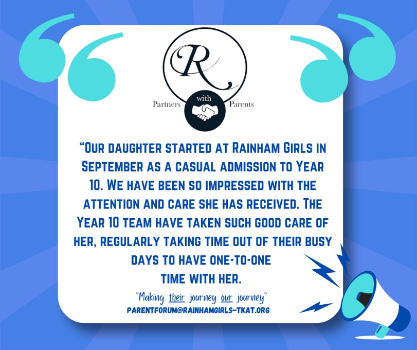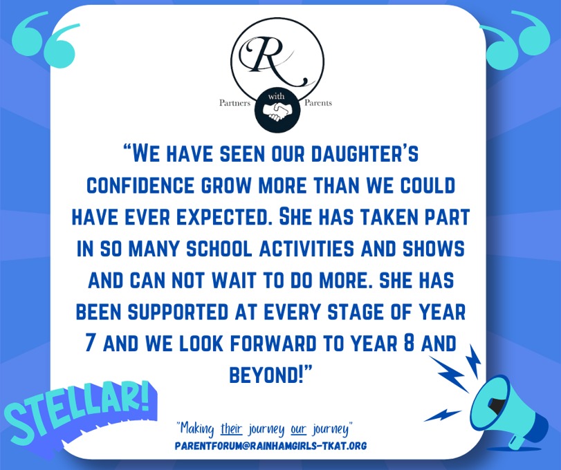 We know that learning and achievement doesn’t stop at the school gate. Our Beyond the Gate initiative gives parents and carers the chance to share with us the incredible things our students are accomplishing outside of school, whether it’s sporting triumphs, creative achievements, or moments of personal pride. Through the Parent Forum, we celebrate these stories on our social media channels, ensuring that our wider community can join us in recognising and honouring the amazing efforts of our students. If you’d like to share your child’s success with us, we would love to hear from you. Please contact us at parentforum@rainhamgirls-tkat.org and let us celebrate together.